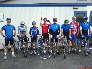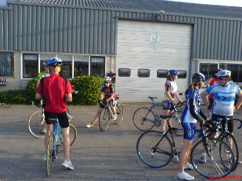 Op het parkoers van Bleiswijk geeft Rene uitleg over de training en deelt de groep in drieën.Er moet kop over kop gereden worden, waarbij het de bedoeling is dat je elkaar snel afwisselt. Dus zodra je op kop komt hou je de benen stil en schuift, doordat de anderen je inhalen, naar achteren. Snel en voortdurend ‘draaien’ en dat met zoveel mogelijk dezelfde snelheid. Om elkaar uit de wind te houden kies je dusdanig positie achter de rijder voor je, dat je uit de wind komt te zitten. Zo ontstaat de zgn. waaier. (een soort ganzentrek, maar dan anders). Het blijft een moeilijke oefening. De verleiding is groot om bij het op kop komen te versnellen. Hierdoor krijg je een intervaltraining, wat niet de bedoeling is. Het rijden in de waaier is ook bijzonder lastig. Vaak ontstaat er een rommelig geheel waardoor je toch weer vol in de wind fietst. Het moeilijkst blijkt nog om een constante snelheid aan te houden. Met de wind in de rug wil iedereen wel lekker doorfietsen en gaat het tempo fors omhoog. Maar hou je dit ook tegen de wind in vol? Niet dus. In onze groep schommelde de snelheid tussen de 32 en 40 km/h. Dit mag allemaal de pret niet drukken, we hebben het drie ronden volgehouden. De eerlijkheid gebied te vermelden dat de een wel meer kopwerk heeft gedaan dan de ander. Bij Lennart was duidelijk te merken dat hij een familieweekend met de Hakkenbergjes achter de rug had. Die heb ik na een paar afwisselingen niet meer op kop gezien. Gewoon volhouden zou ik zeggen, dan krijg hij net zo’n (stap)conditie als de rest van de familie. Natuurlijk had ik zelf ook een zware avond, want te weinig slaap, te veel drank en te veel BBQ hakt er behoorlijk in. Maar geen krimp gegeven natuurlijk!